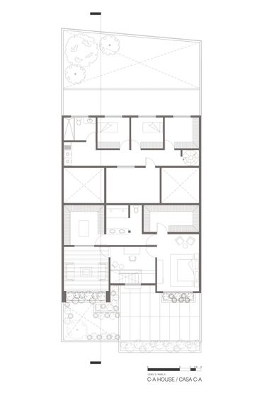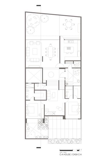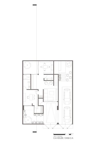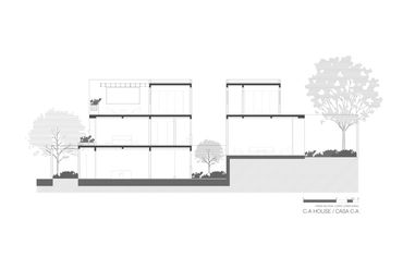 Ubicada en el poniente de la Ciudad de México, la Casa C-A se desplanta en un terreno con una pendiente ascendente desde la calle. Dicha característica permite dividir el volumen de la casa en dos bloques. El primer cuerpo, de tres niveles, alberga el área privada del usuario: tres recamaras, estar familiar, estudio y oficina. El segundo bloque contiene el programa público en dos niveles, conformado por cocina, sala, comedor, bodega, área de lavado y servicio.