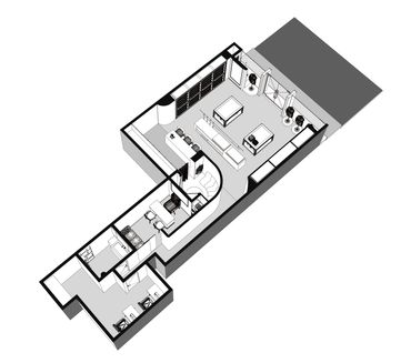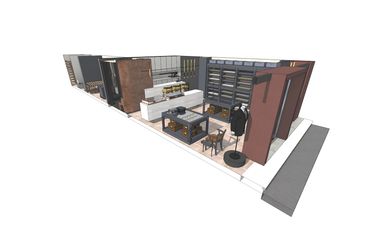 La combinación de maderas, mármoles nacionales, acentos dorados y lambrines textiles crean un espacio elegante y masculino que pretende imitar la atemporalidad de la alta costura que alberga. Los mostradores son bloques de mármol travertino en su acabado natural, tan elementales que sirven como lienzos perfectos para la exhibición y selección de las telas mas prestigiadas del mundo. Un candil, con cinco lámparas de un dorado cepillado, adorna a manera de móvil geométrico la panorámica de la sastrería, tal como los accesorios complementan el buen vestir. Se buscó un estilo sobrio y una sutil combinación de iluminación puntual con indirecta, no solo para crear una atmósfera, sino para generar una experiencia de compra única para el usuario. La geometría del local busca ser elemental en sus formas, compuesta por la intersección de una serie de prismas rectangulares y cilindros, cuyos cambios de superficie son acentuados por los diferentes materiales que los componen.